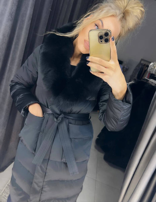 IšparduotaJuodas Žieminis Paltas su Prabangiu Kailiu
