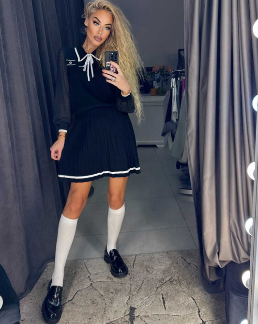 Viskozės kostiumėlis su megztiniu ir klostuotu sijonu