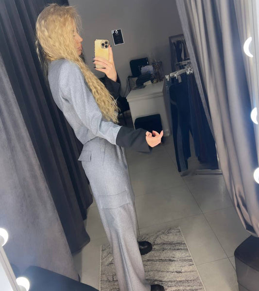 IšparduotaPilkas Kostiumas su Juodais Rankogaliais