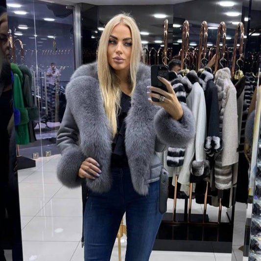 IšpardavimasPilka Odinė Striukytė su Lapės Kailiu