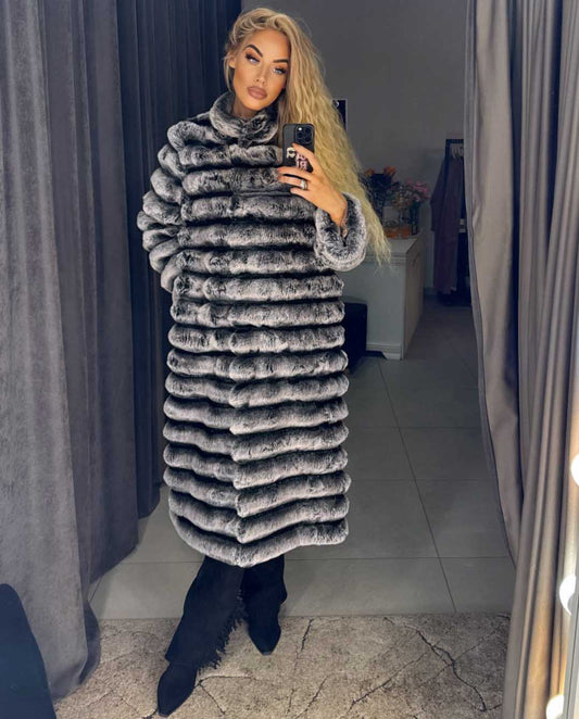 Weiße lange Pelzmäntel mit schwarzen Einsätzen