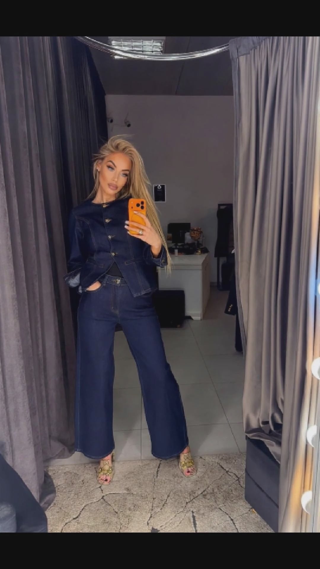 - The suit consists of two parts – a long-sleeved jacket and high-waisted jeans;