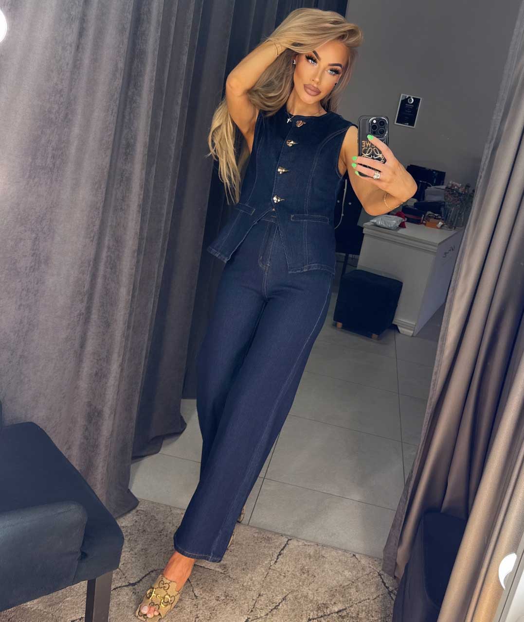 Liemenė turi elegantiškas aukso spalvos sagas, kurios suteikia jai elegantišką, akį traukiantį akcentą. Dėvint kartu, komplektas sukuria drąsų mados pareiškimą, tačiau galite derinti ir atskirus drabužius. Džinsai yra aukštu kirpimu, kuris pailgina kojas ir pabrėžia liemenį. Jis puikiai tinka darbui, savaitgaliams ar laisvalaikiui.